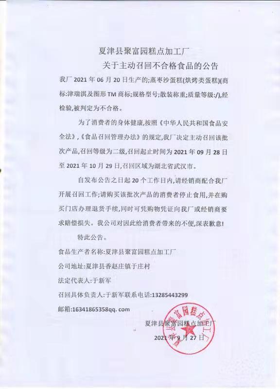 我廠2021年06月20日生產的;蒸棗沙蛋糕(烘烤類蛋糕)(商標:津瑞淇及圖形TM商標;規格型號;散裝稱重;質量等級:/),經檢驗,被判定為不合格。